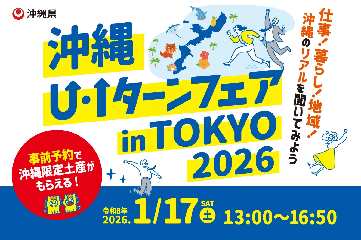 沖縄での就職・転職を考えている方へ——。 「沖縄で働くこと」「沖縄で暮らすこと」のリアルが一度に分かるイベント 『沖縄U・Iターンフェア in TOKYO 2026』 が開催されます。 当日は、沖縄を代表す